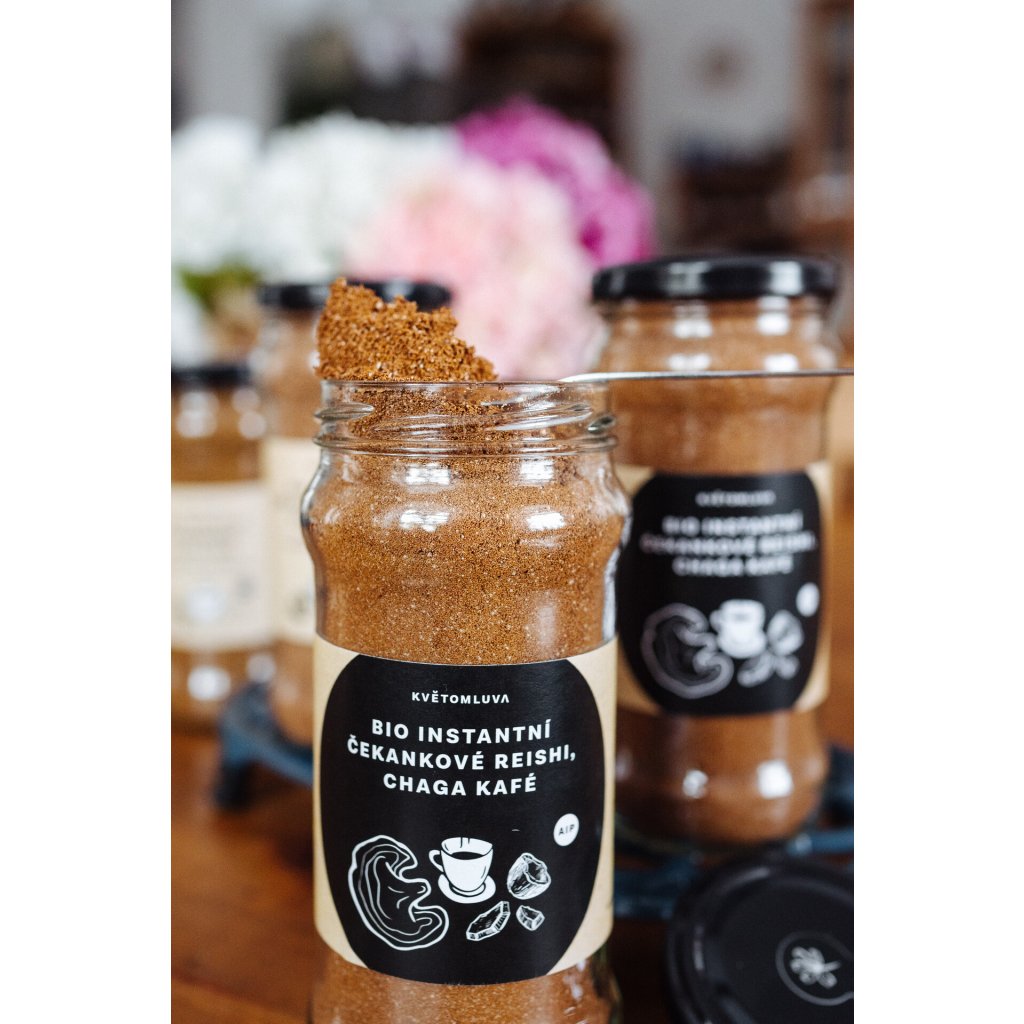 - Složení: BIO kořen čekanky 70%, BIO extrakt z dužiny kokosových ořechů, BIO extrakt Reishi (Ganoderma lucidum) 3 %, BIO Extrakt Chaga (Inonotus Obliquus) 3%, BIO tapioka